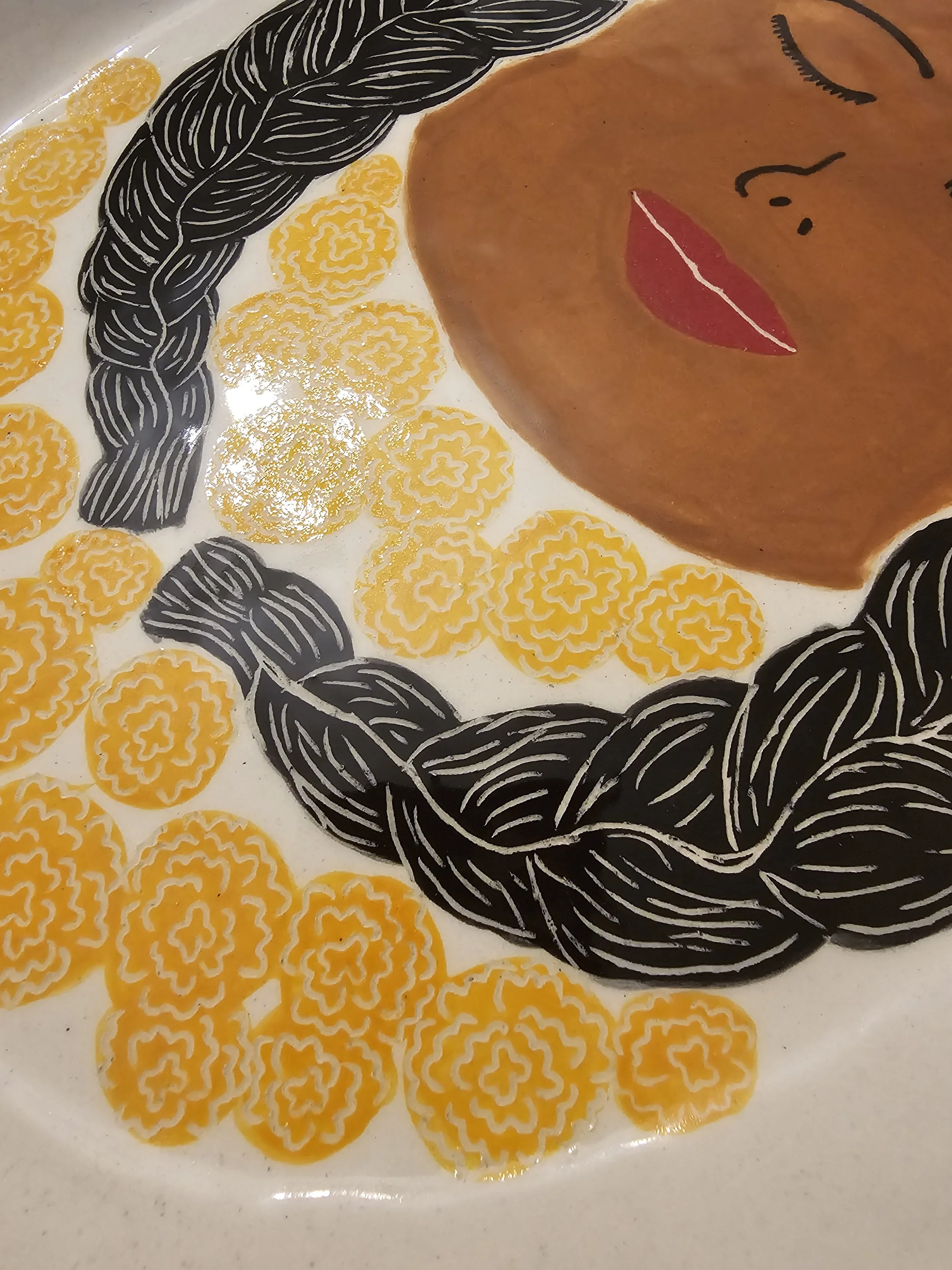 Shop › Mujer y Florecitas Image 1 of 2 Image 2 of 2 Mujer y Florecitas $165.00 Large 14” platter made from white stoneware with sgraffito carved portrait. Add To Cart Added! Large 14” platter made from white stoneware with sgraffito carved portrait.
